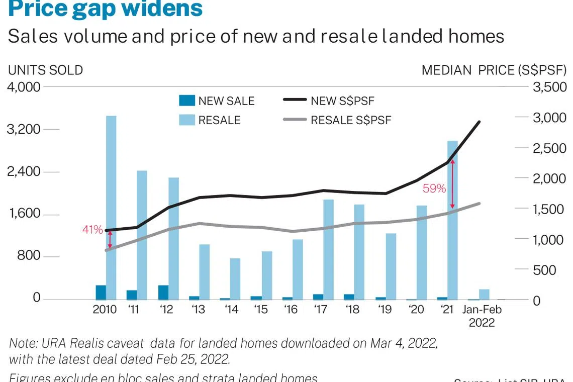 Over the 2010-2021 period, the price of new landed homes nearly doubled from S$1,146 psf in 2010 to S$2,247 psf in 2021 while the price of resale landed homes grew by 74 per cent from S$811 psf to S$1,414 psf. This in turn translated to a gap of 41 per cent between new and resale landed home prices in 2010 which widened to 59 per cent in 2021.