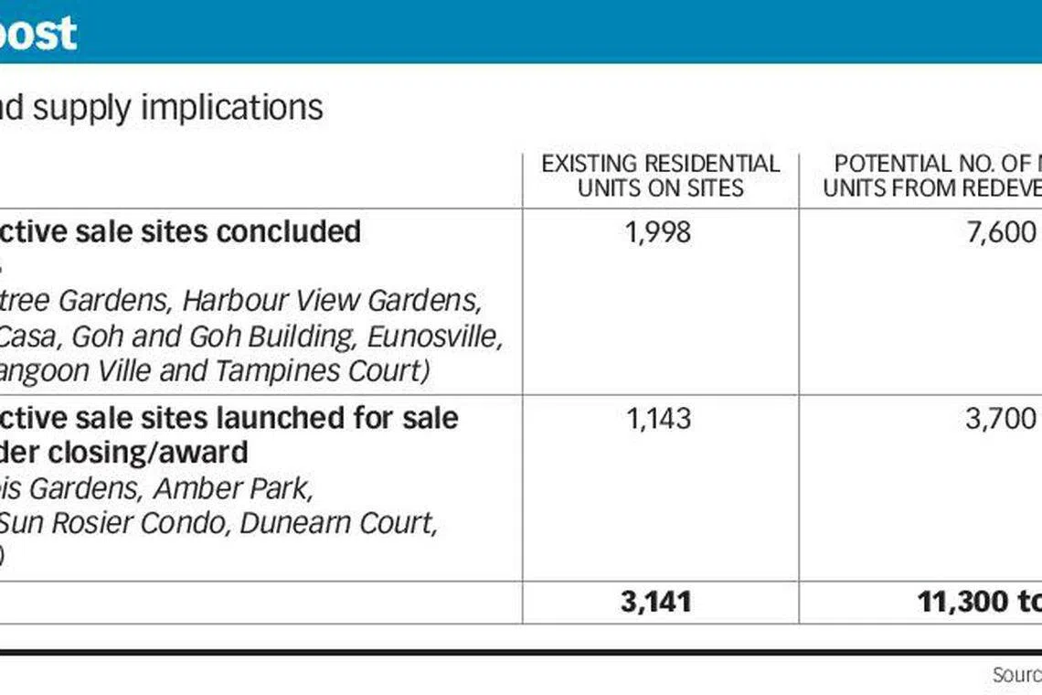 A veteran property consultant who declined to be named highlighted that a number of the en bloc sales launched since last year involve huge sites, each of which may potentially be redeveloped to more than 1,000 new homes. Examples include former HUDC estates such as Tampines Court, Serangoon Ville, Eunosville, Rio Casa, Florence Regency and Shunfu Ville.