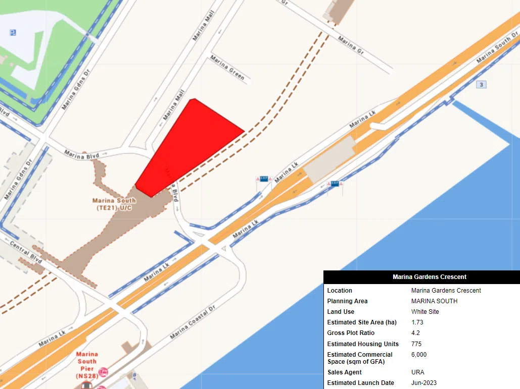 The Marina Gardens Crescent parcel can yield about 775 private homes and 6,000 square metres (sq m) gross floor area (GFA) of commercial space. It is zoned under the city fringe, or Rest of Central Region.