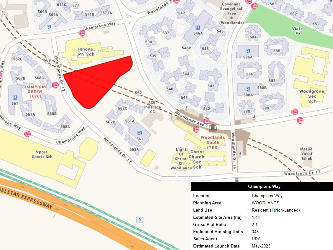 The parcel at Champions Way in Woodlands can generate 345 units, with a 500 sq m minimum for childcare space, and is expected to launch in May 2023. JLL’s Chia expects the land parcel to attract top bids of around S$235 million or S$722 psf ppr.