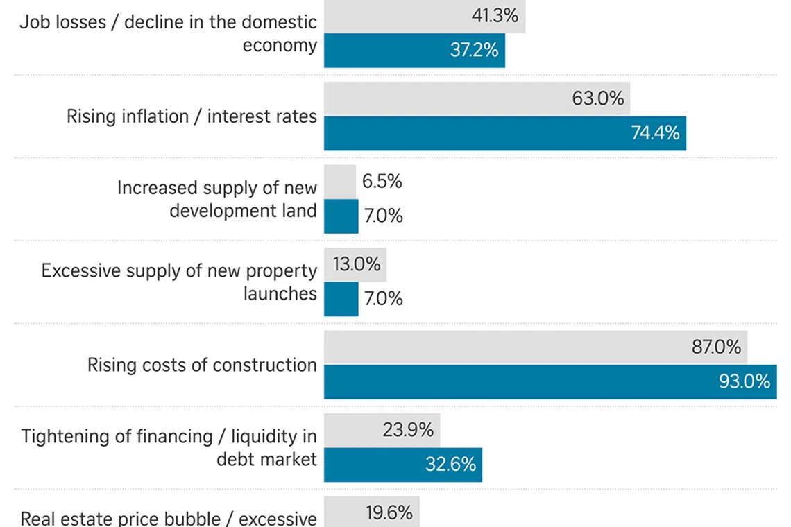 Labour and building material costs was the top concern among the developers surveyed, with 86.4 per cent and 77.3 per cent indicating that they were "very concerned" about these costs, respectively.