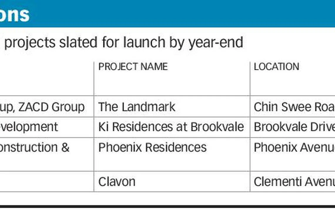 These include The Landmark in Chin Swee Road, Ki Residences at Brookvale in the Sunset Way locale, Phoenix Residences in Phoenix Avenue (off Choa Chu Kang Road) and Clavon in Clementi Avenue 1.
