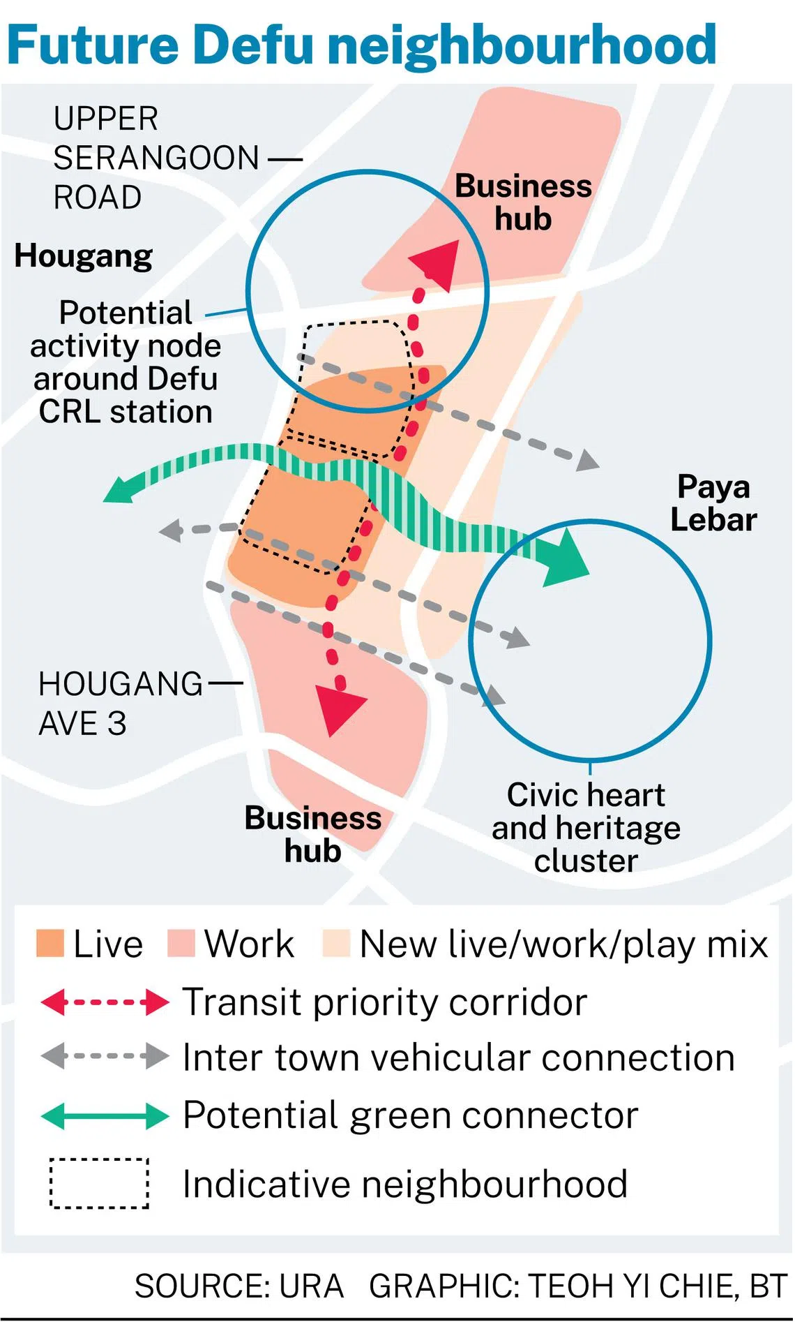 The Defu industrial belt next to Paya Lebar Air Base is on land leased to JTC and state-owned land. The locale is slated to be turned into a community-centric neighbourhood with live, work and play options. The area’s connectivity will be boosted with an MRT station on the Cross Island Line.