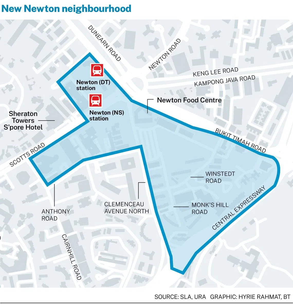 URA said: “A new amenity node with high-density and mixed-use developments anchored by a central public space envisaged as a ‘village square’ will be introduced next to Newton MRT station (on the North-South Line) and Newton Food Centre to provide residents with amenities and more food options.”