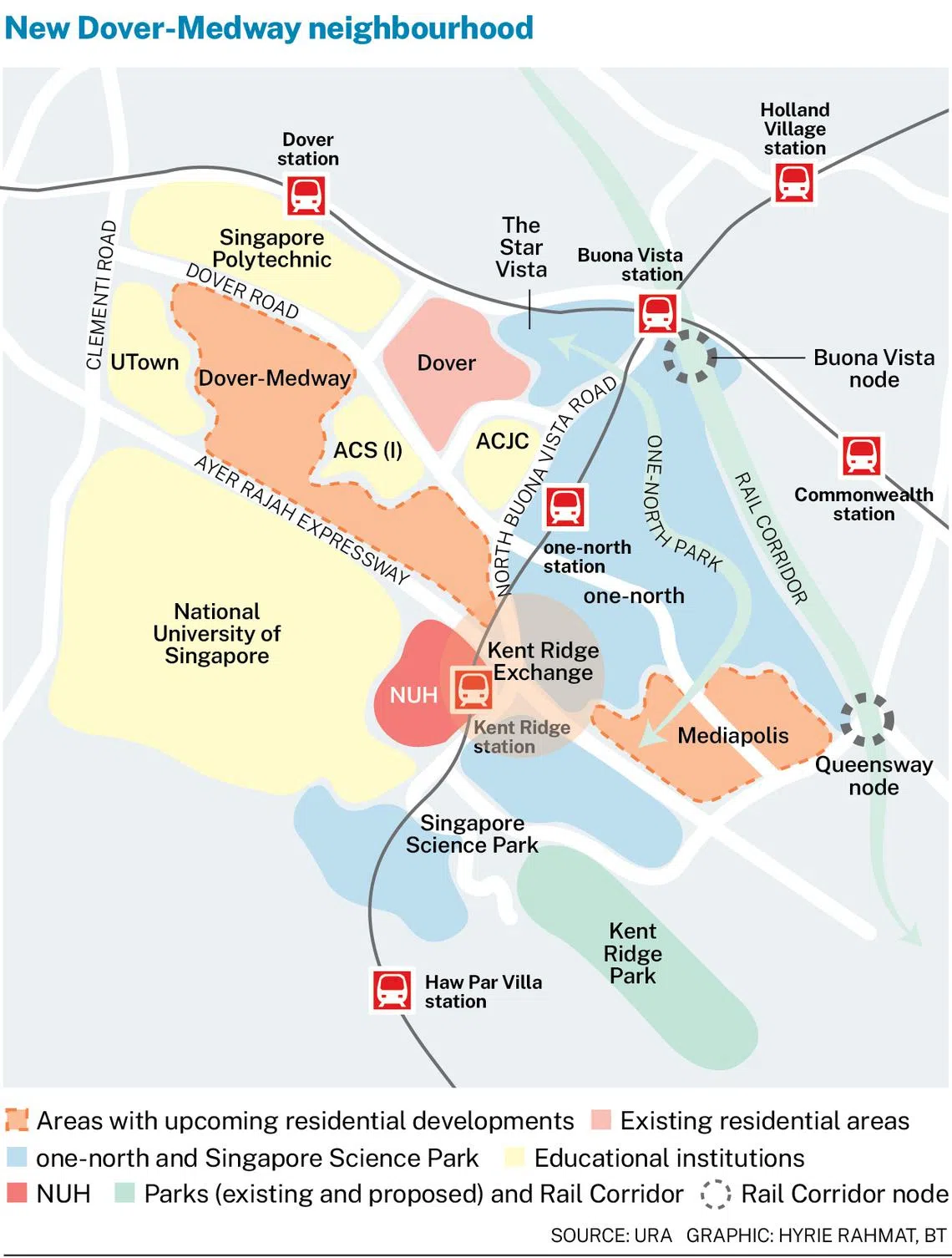 URA’s Draft Master Plan shows that in the Greater one-north knowledge hub, a new neighbourhood, Dover-Medway, has been earmarked for a mix of public and private homes complemented by new amenities and recreational spaces.