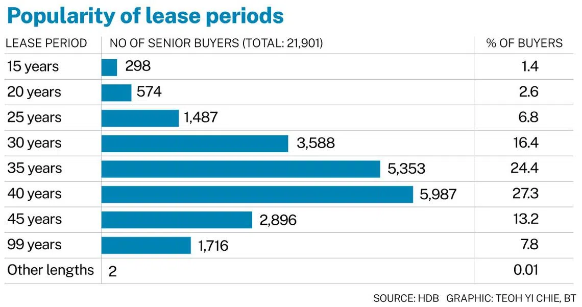 The 40-year lease was the most popular, with 27.3 per cent of senior buyers opting for it. This was followed by the 35-year lease with 24.4 per cent of buyers and the 30-year lease, with 16.4 per cent of buyers.