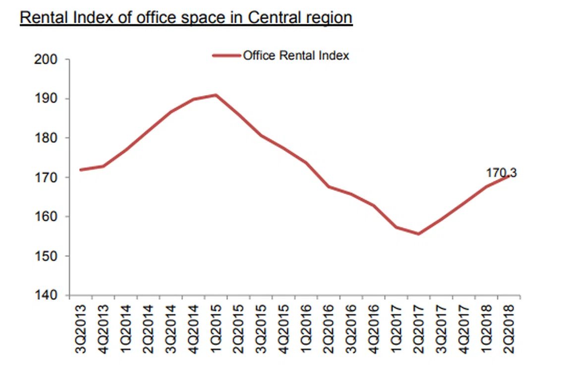 On the other hand, prices of office space in the central region increased by 1.9 per cent in second quarter, a faster clip than the 1.3 per cent increase in the previous quarter.