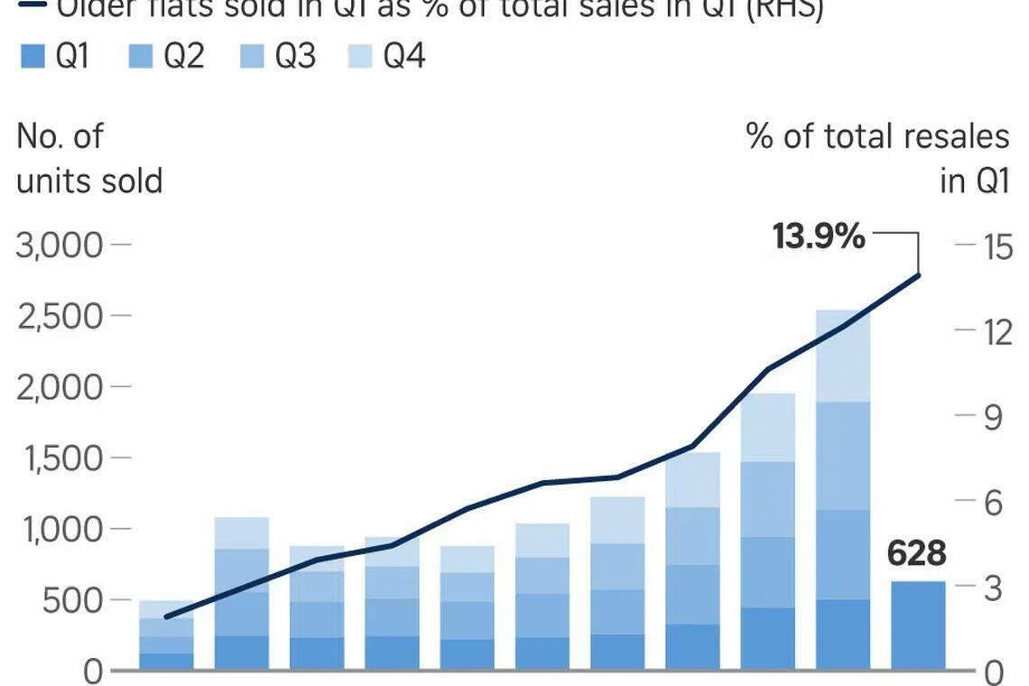 For the first quarter this year, 628 older flats - that is, those that are more than 40 years old - were sold, constituting 13.9 per cent of total resale transactions. This is the highest percentage of older flats sold on record, the property consultancy noted.