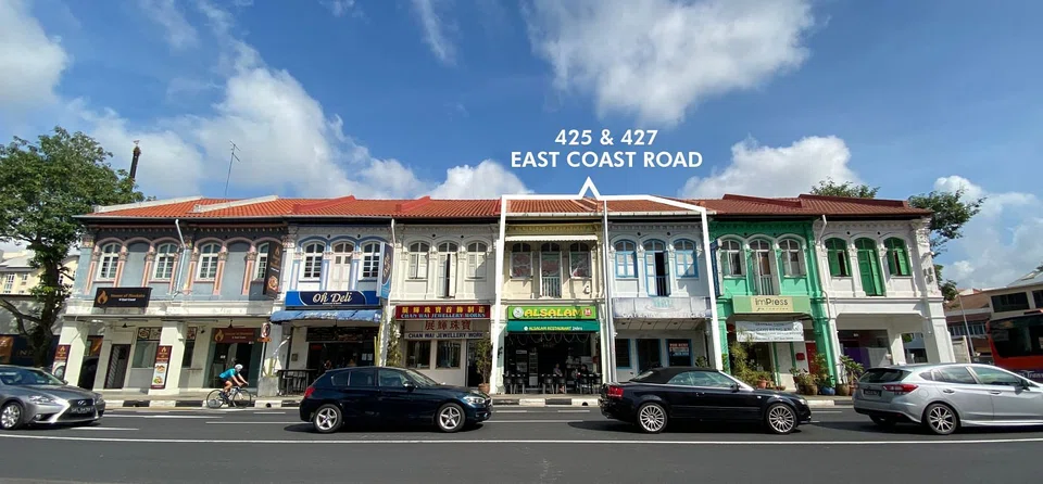 The two-storey shophouses sit on a freehold land plot of about 2,380 sq ft. They have a total existing built-up area of around 3,960 sq ft, and a 10 metre frontage along East Coast Road.