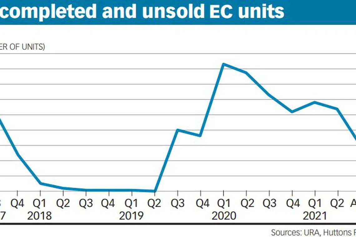 As at Aug 23, 2021, developers had sold more than 90 per cent of the total 4,136 units launched since Q3 2017, leaving an estimated 300 uncompleted EC units unsold. The number of unsold EC units has been trending downwards since Q1 2020.
