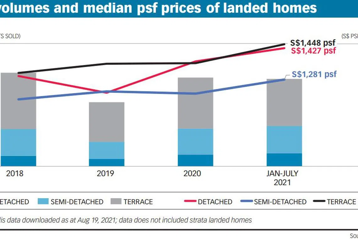 Based on prices per square foot (psf) of land area, the three types of landed properties have charted a general uptrend from 2018 to July 2021. Semi-detached houses clocked the biggest gain of 10.5 per cent in that period to reach S$1,281 psf. Prices grew 9.7 per cent to S$1,448 psf for terrace houses, and 9.6 per cent to S$1,427 psf for detached houses.