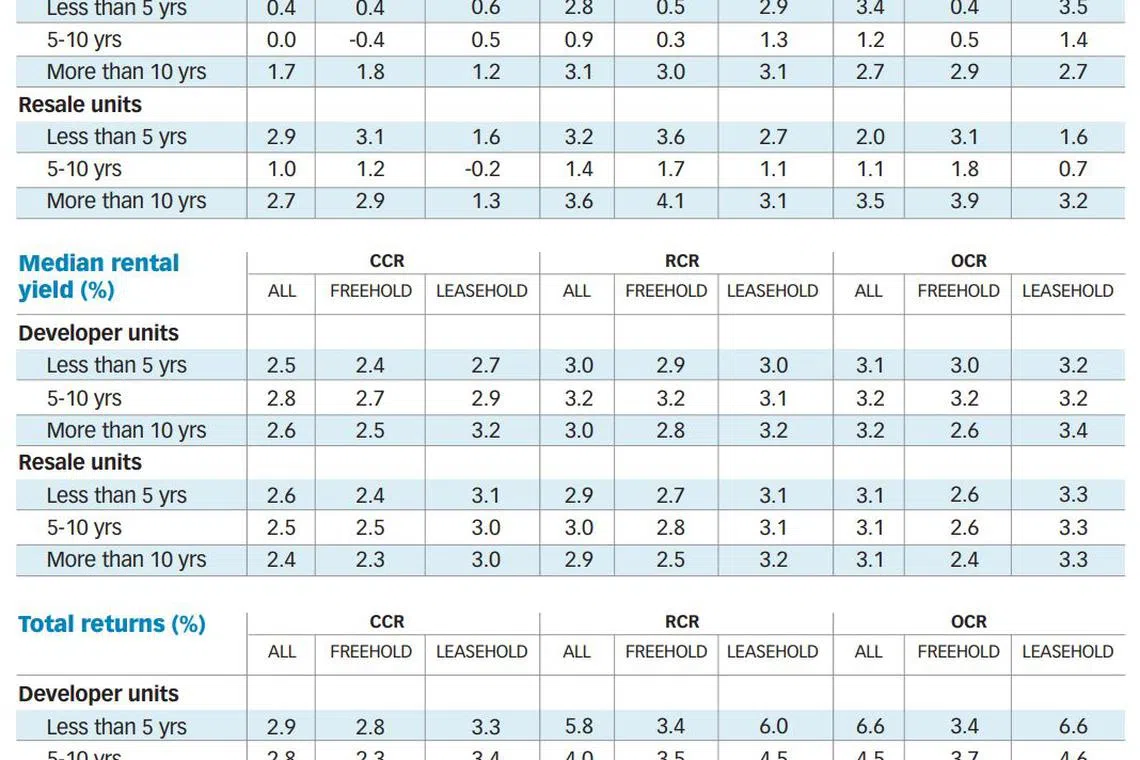 However, total returns arise from both capital gains and rental yields. On average, resale units provided somewhat higher total returns than developer units.
