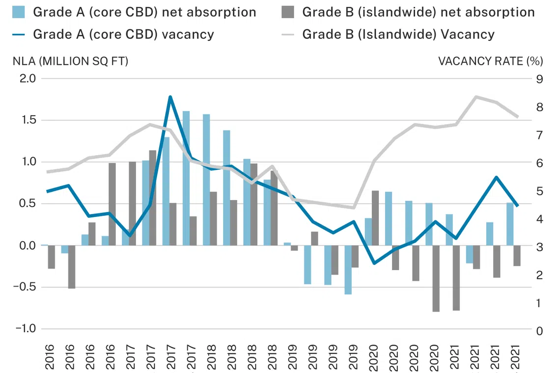 The office market is a 2-tier market, with a widening demand gap between prime and subprime assets. In 2021, the Grade B market registered negative absorption of 0.25 million sq ft as some cost-conscious occupiers downsized, while others leveraged the downturn to take "flight to quality".