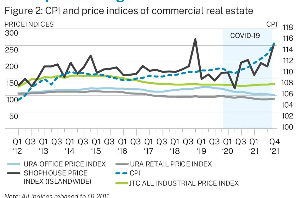 Inflation brings about rate hikes but office and shophouse prices stayed firm.