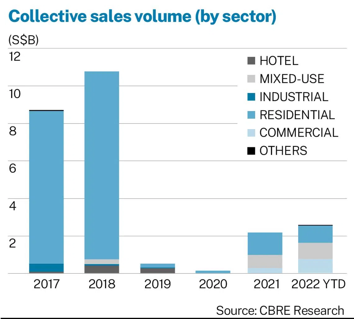 Historically, collective sales have been dominated by residential projects. During the recent collective sale wave in 2017 to 2018, 93 per cent of collective sales worth over S$18 billion comprised residential transactions. However, that trend appears to be changing, even as total volumes have declined.