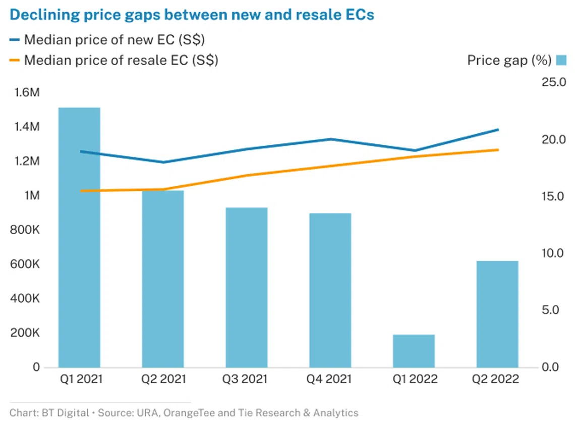New ECs may continue to attract buyers as the price gap between new and resale ECs is closing. The price gap between new and resale ECs was 22.9 per cent in Q1 2021, narrowing to 9.4 per cent in Q2 2022.