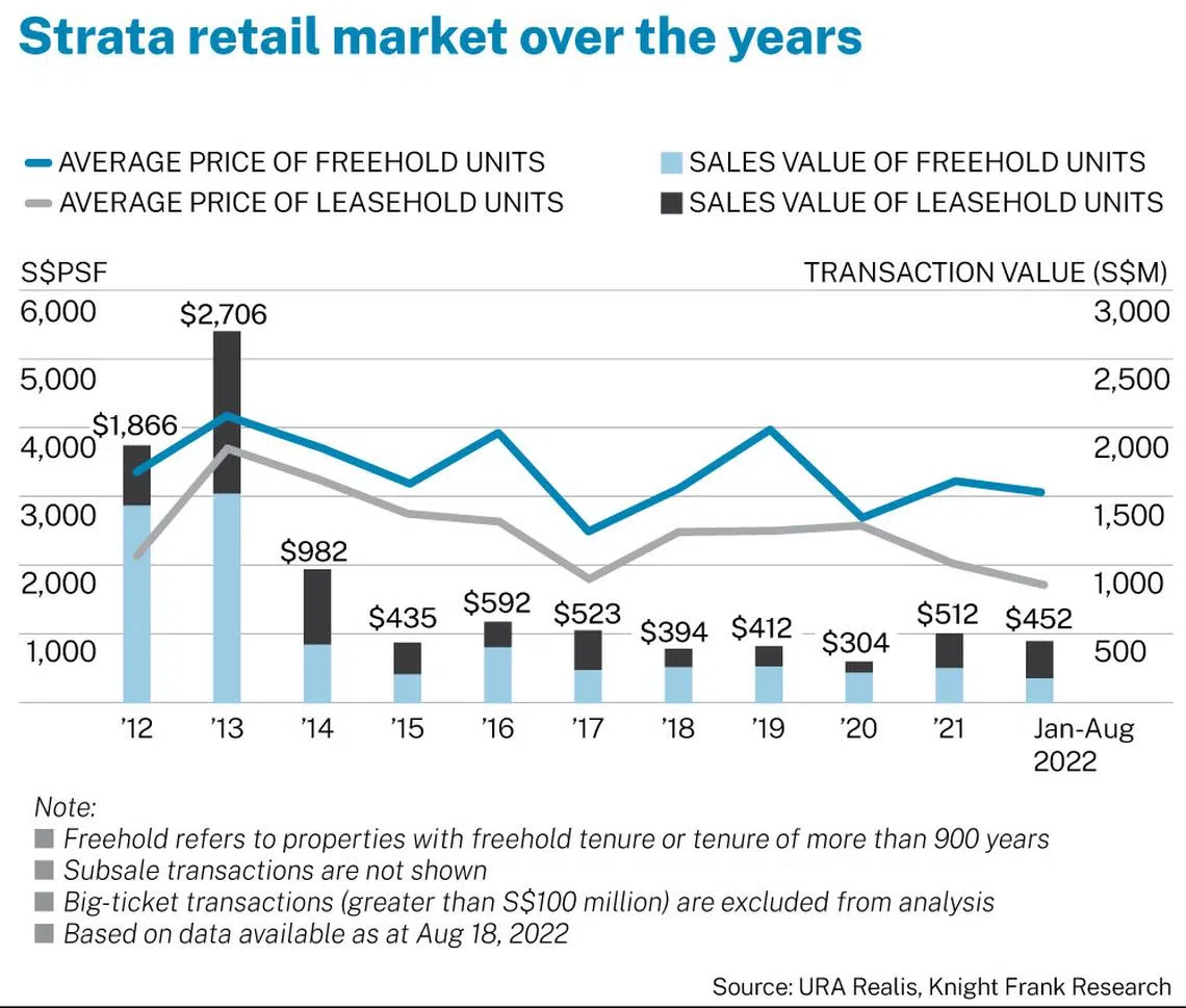 In 2022, as Singapore transitions to endemic living, the overall performance of the strata retail market remains sanguine. In the first eight months of the year, a total of 162 units worth some S$452.1 million were sold.