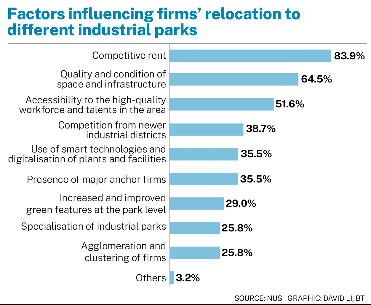 An overwhelming majority – 84 per cent – of respondents said that a competitive rental rate is the key determinant in relocation decisions, based on a poll by the National University of Singapore (NUS) Business School released on Wednesday (Nov 27).