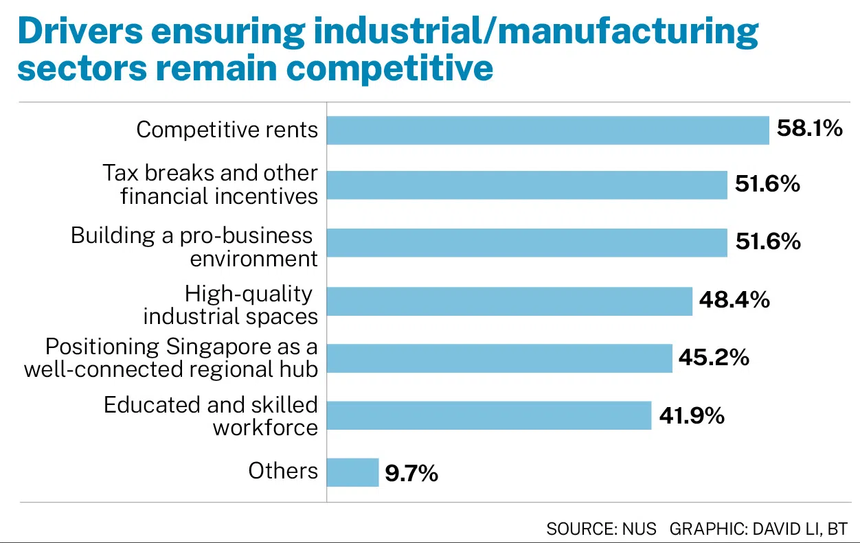 In terms of what drivers would ensure that the Singapore industrial sector remains competitive, 58 per cent cited competitive rents as key, while 52 per cent pointed to tax breaks and financial incentives.