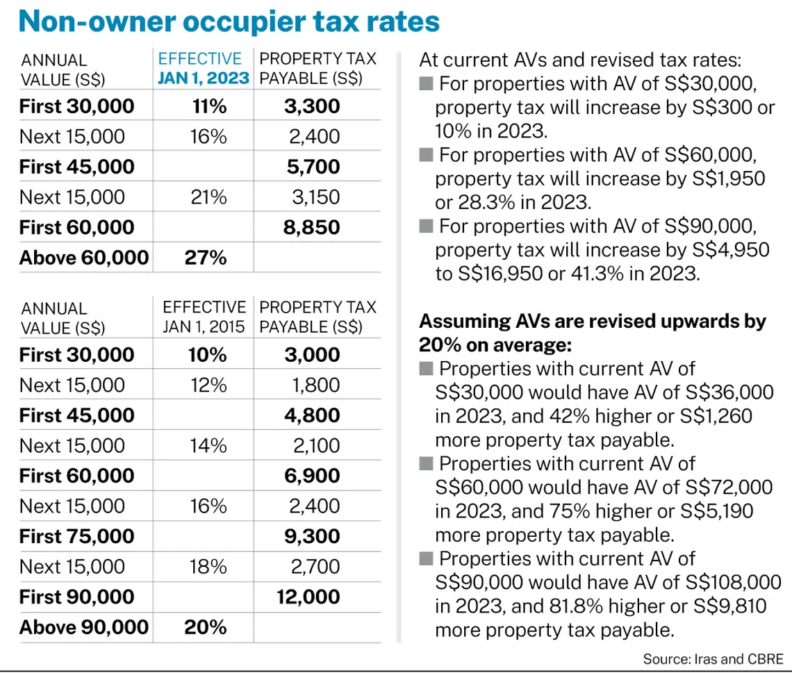 - Non-owner occupiers holding properties with a current AV of S$30,000 would have an AV of S$36,000 in 2023. Their property taxes will climb by S$1,260 or 42 per cent next year.