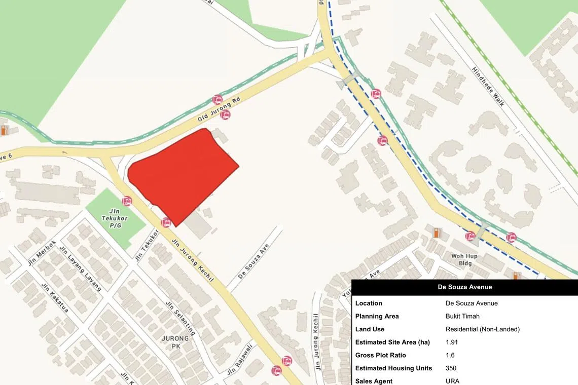 - A 1.91 ha land parcel along De Souza Avenue in Upper Bukit Timah for 350 homes, with a minimum 500 sq m GFA for childcare centre services; and