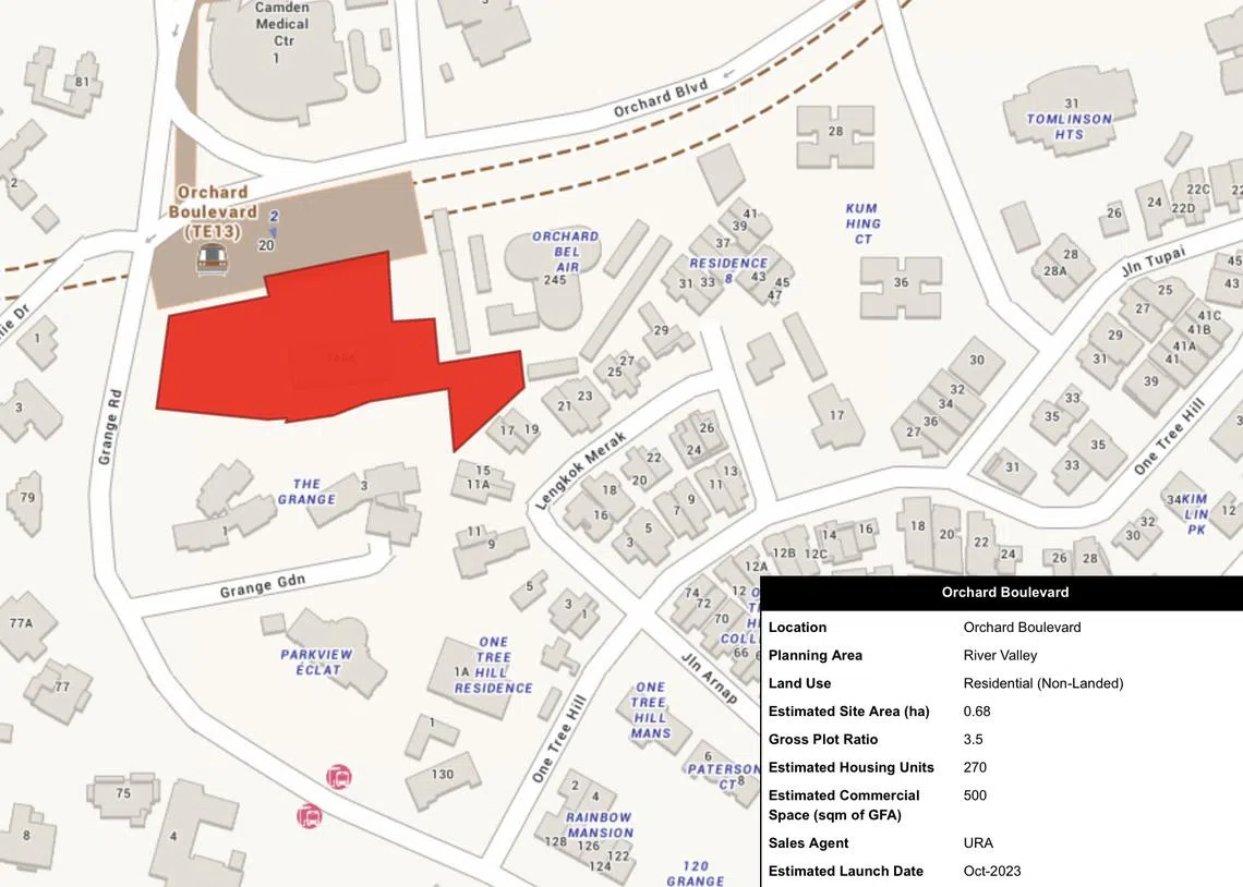 The Orchard site on the H2 2023 confirmed list is a modest 0.68 hectare (ha) piece of land just beside the Orchard Boulevard MRT station on the recently-opened Thomson-East Coast Line (TEL).