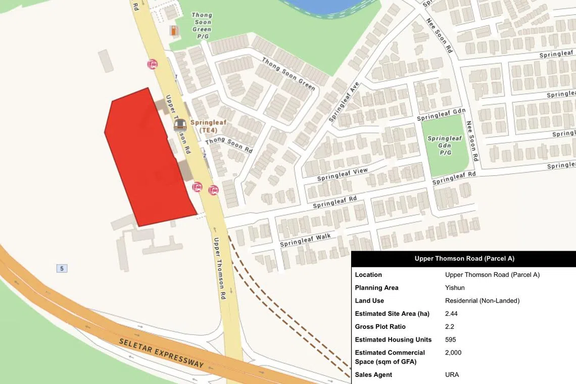 The Upper Thomson Road (Parcel A) site, which spans 2.44 ha, can yield about 595 homes and 2,000 sq m GFA of commercial space. It has a 2,000 sq m cap on retail space and a minimum GFA of 1,000 sq m for childcare centre services. Serviced apartments are allowed.