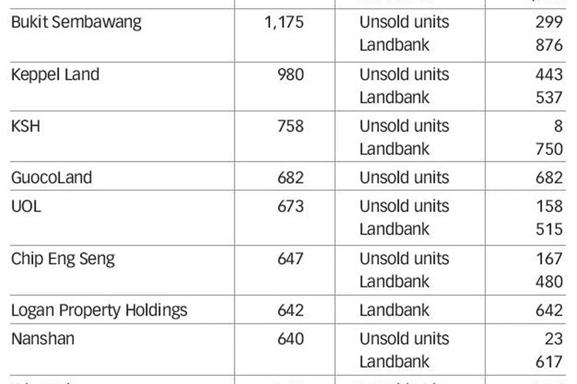 So far, local developers make up seven of the top 10 developers with the largest residential landbank and leftover unsold units in launched projects, based on The Business Times' compilation across developers. Two of the top 10 developers - MCL Land and GuocoLand - are technically foreign developers by virtue of controlling shareholding, but have operated in Singapore for a long time. More than half of all residential inventory is in the hands of the top 10 developers.