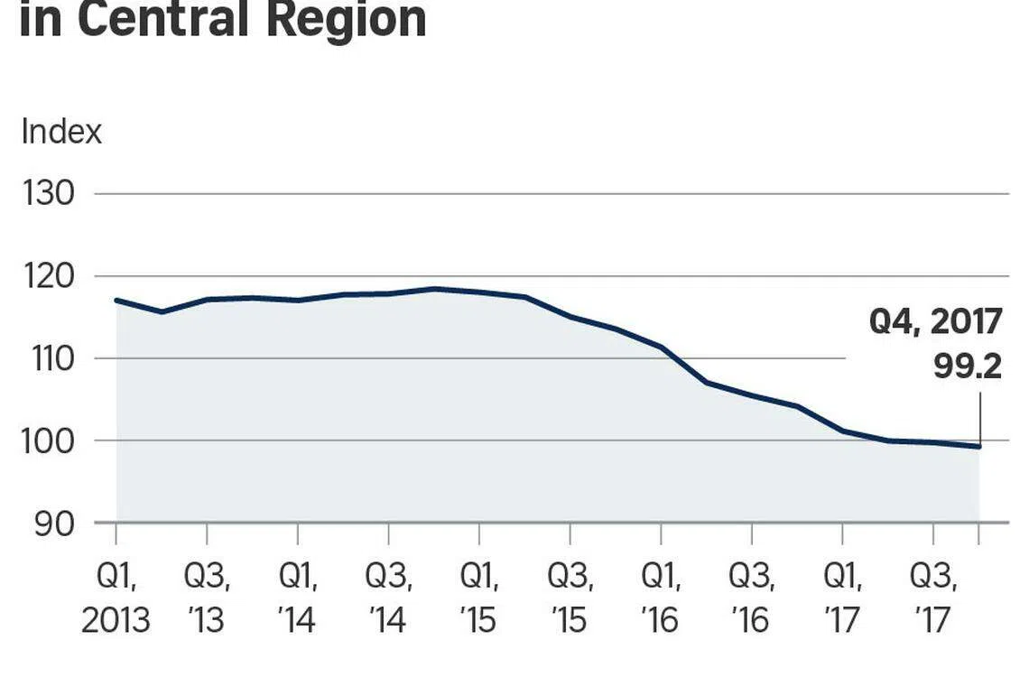 This was a bigger drop compared with the 0.2 per cent quarter-on-quarter decline posted in Q3 2017, the data from the Urban Redevelopment Authority (URA) showed on Friday morning.