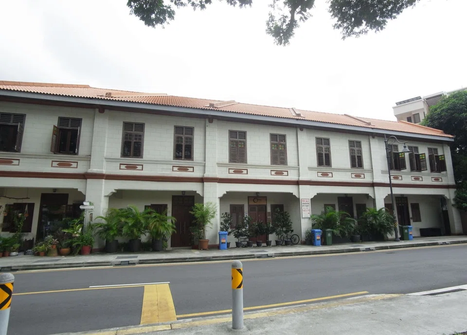 The row of shophouses is situated along a quiet street, with parking lots available at a public car park just across the road.