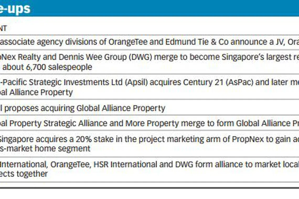 The setup of the JV, named OrangeTee & Tie, comes two months after homegrown property agencies PropNex Realty and Dennis Wee Group (DWG) announced their merger to form Singapore's largest real estate agency. It has a 6,700-strong pool of salespeople.