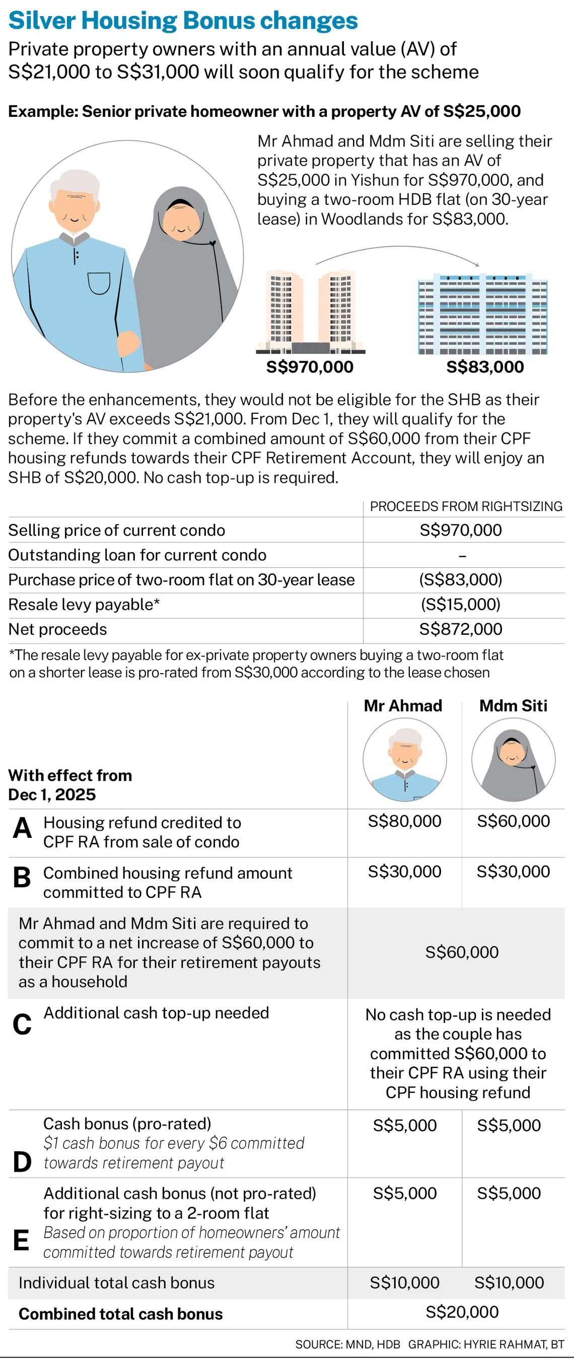 From Dec 1, 2025, seniors will qualify for the SHB as long as they commit up to S$60,000 in their CPF RA – whether in cash proceeds from their home sale or from their CPF housing refunds.
