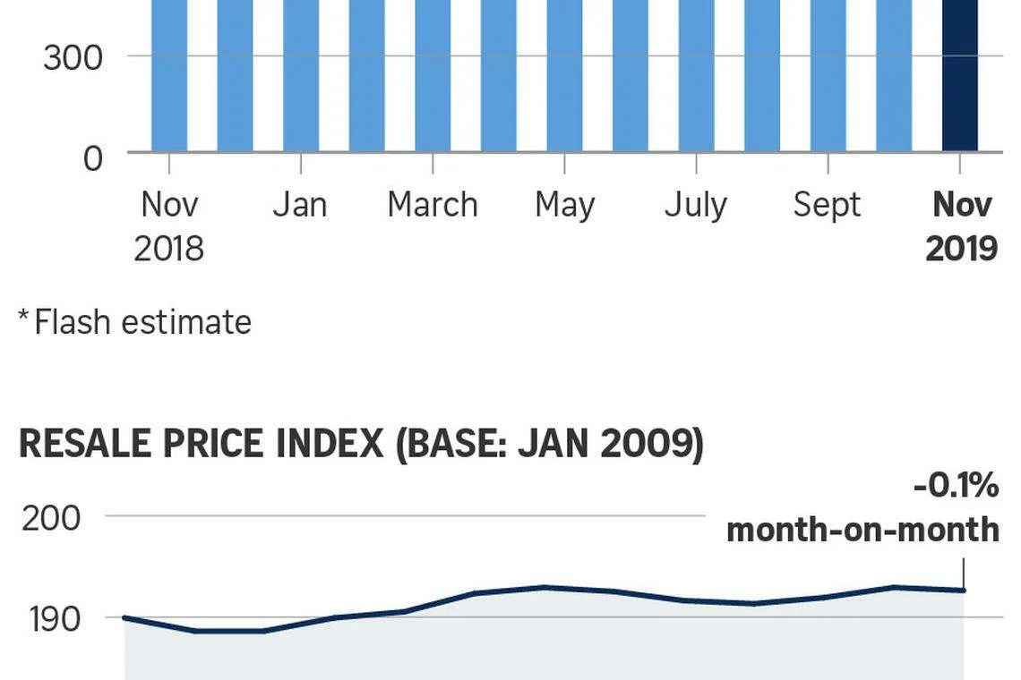 RESALE prices for non-landed private residential properties in Singapore dipped slightly in November after two straight months of increase. Sales volumes also declined, according to flash figures from real estate portal SRX Property on Tuesday.