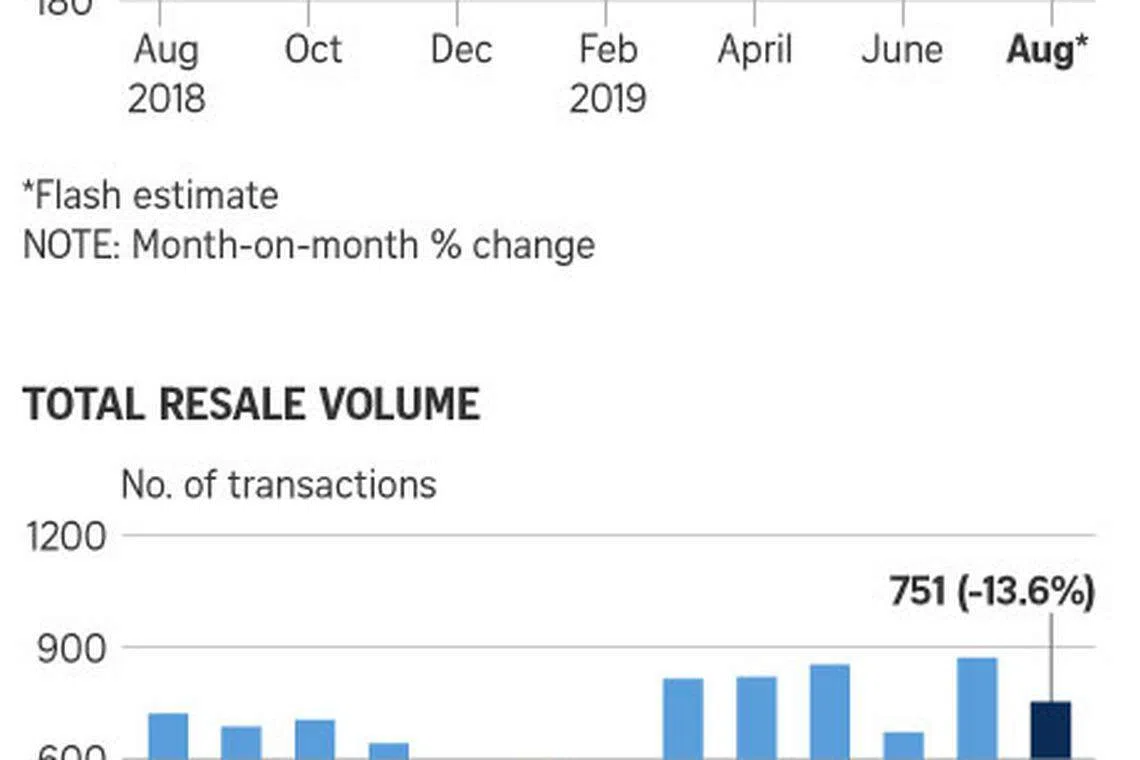 Sales volume fell by 13.6 per cent with 751 units transacted in August, compared with 869 units resold in July.