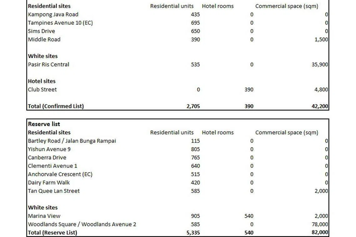 All in, sites under the Confirmed List and Reserve List can yield up to 8,040 private residential units, 124,200 sq m gross floor area (GFA) of commercial space and 930 hotel rooms, the Urban Redevelopment Authority (URA) said on Wednesday.