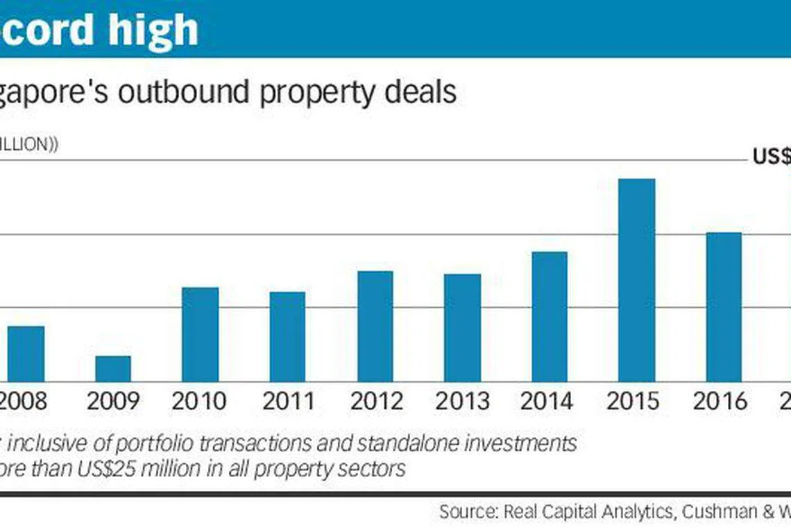 SINGAPORE monies that went into overseas real-estate investments last year rose by about 40 per cent to a record US$28.4 billion, up from US$20.4 billion in 2016 and upending the last high of US$27.6 billion in 2015.