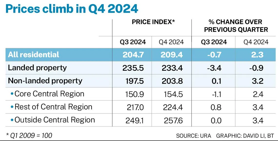 PRIVATE residential property prices in Singapore rose 2.3 per cent in the fourth quarter of 2024, bringing the full-year increase to 3.9 per cent, according to flash estimates released by the Urban Redevelopment Authority on Thursday (Jan 2).