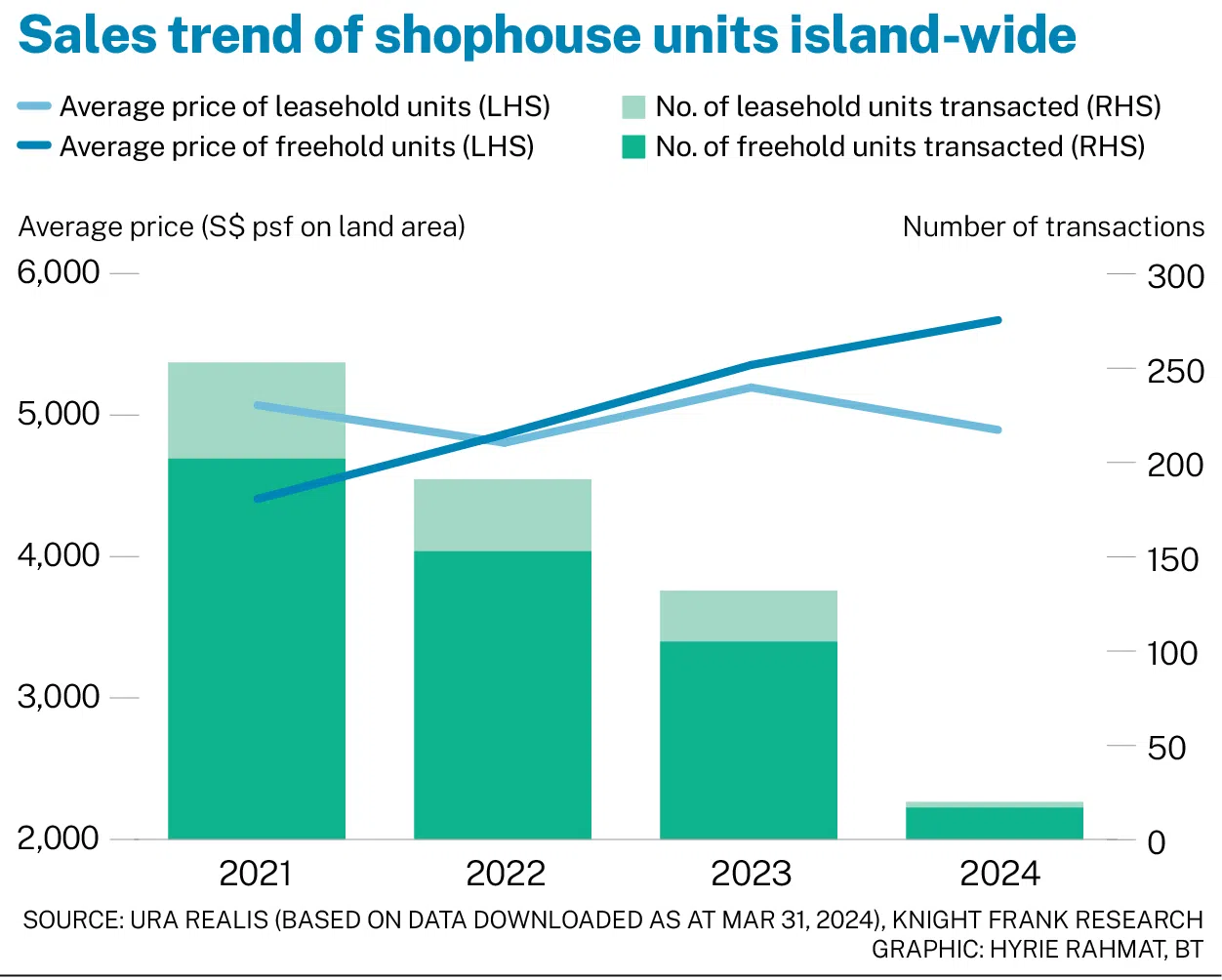 Total transaction value for freehold shophouse units sold in Q1 rose 44 per cent from the previous quarter at S$149.9 million. Leasehold unit sales came to S$19.2 million, up 175.9 per cent from Q4 2023.