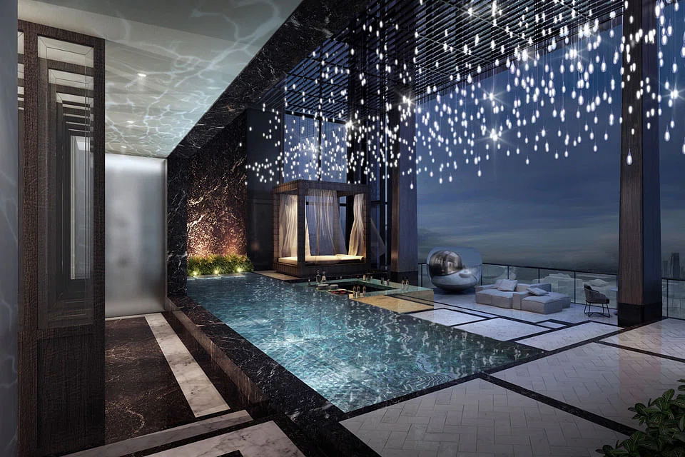 The top level of the super penthouse has a private pool, pool deck area, cabana, jacuzzi room, entertainment area and a cantilevered balcony with panoramic views including of the CBD, Marina Bay and Sentosa.