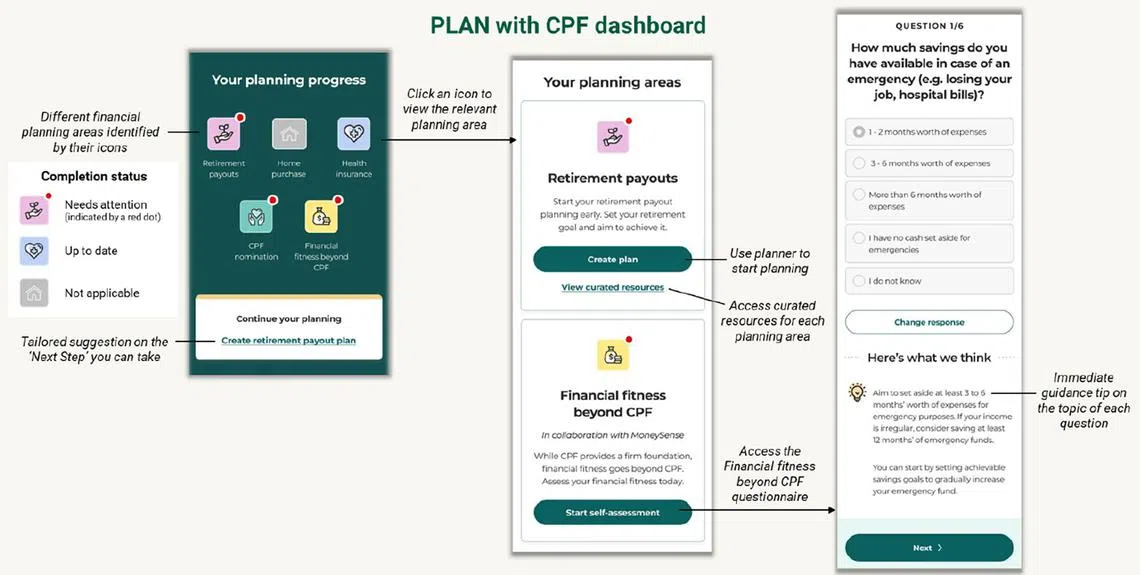 The platform also provides educational resources on financial planning, and a financial fitness questionnaire that allows users to assess their overall financial health beyond CPF matters.