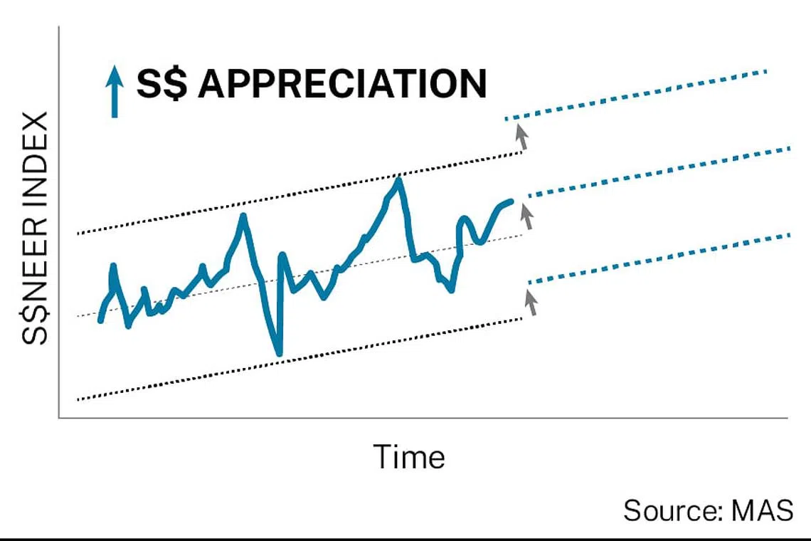 What this means: The slope of the band controls how quickly MAS allows the Singdollar to appreciate against a basket of currencies. If MAS steepens the band's slope, it is allowing the Singdollar to appreciate faster. Conversely, a flattening of the slope would cause the Singdollar to appreciate at a slower pace.
