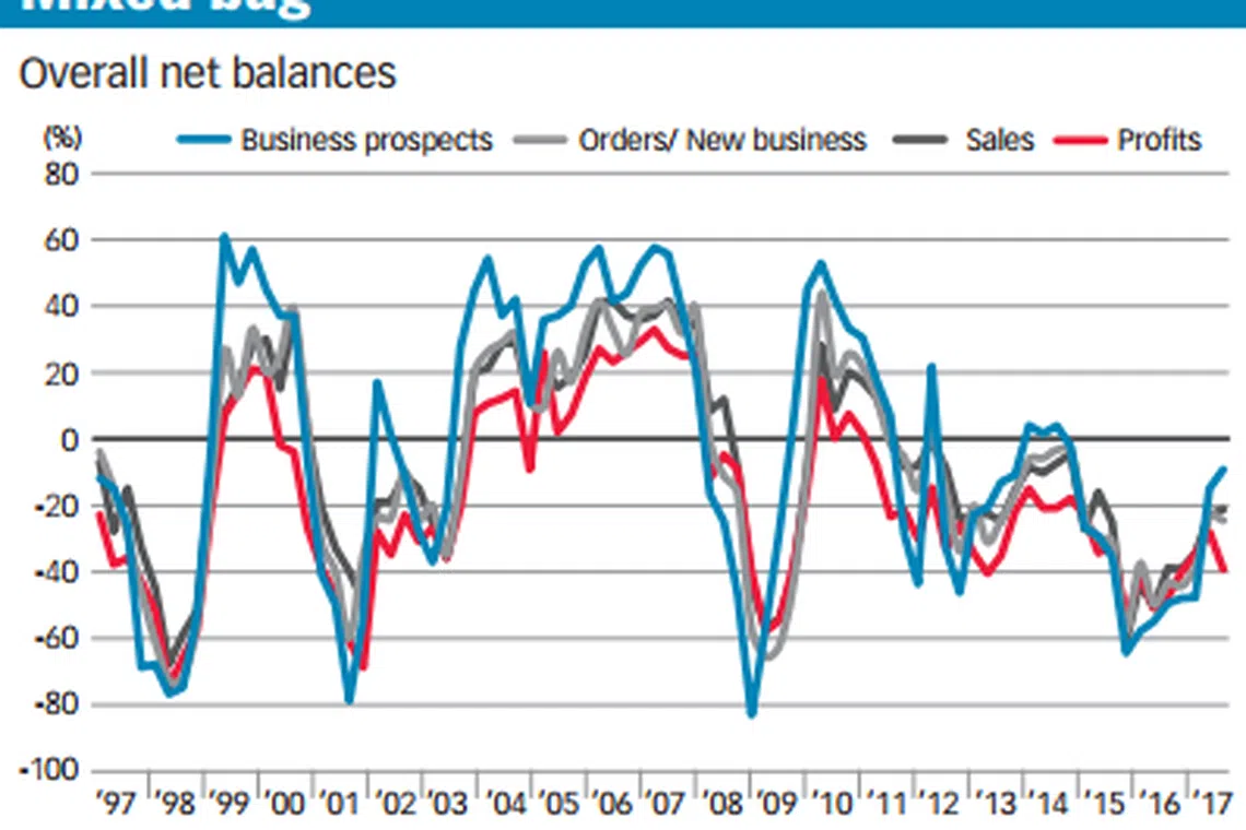 The BT-SUSS survey showed sales net balance was better by 2 points to -21 per cent in Q2, with 3 per cent more firms reporting up to 25 per cent rise in sales compared to Q1.