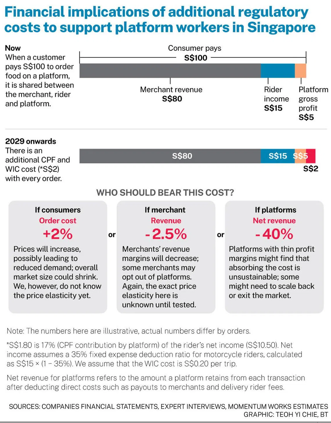 Momentum Works estimates that customers would pay 2 per cent more if the CPF costs are passed on to them. Merchants would see a 2.5 per cent drop in revenue if they have to pay for CPF costs. Platforms might see a 40 per cent decline in revenue if the CPF costs are absorbed by them.