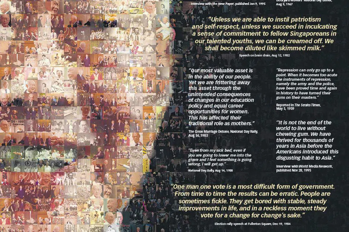 In his own wordsSharePublished Tue, Mar 24, 2015 · 09:50 PM More Infographics:READ MORE:Lee Kuan YewInfographicsCopyright SPH Media. All rights reserved.Reuse this contentFeedback