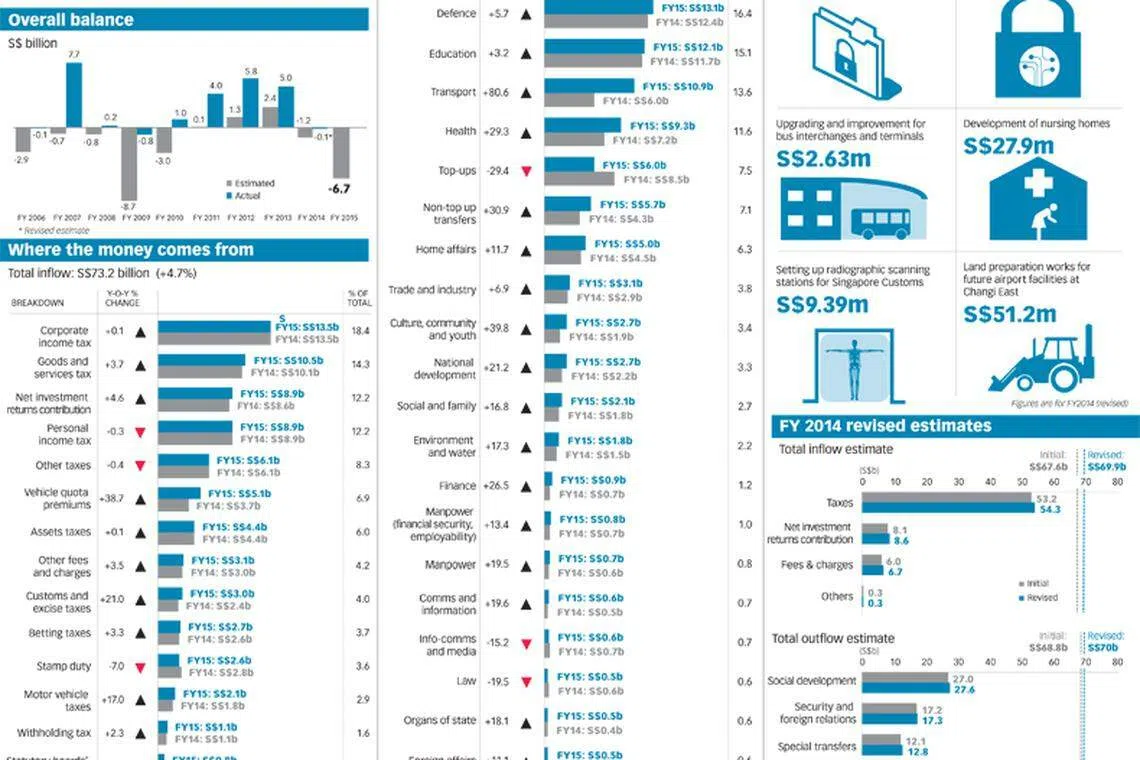 Key budget numbersSharePublished Mon, Feb 23, 2015 · 06:03 PM To see all of BT's Budget 2015 infographics, go to btd.sg/bud15graphREAD MORE:InfographicsShare with us your feedback on BT's products and servicesFeedback