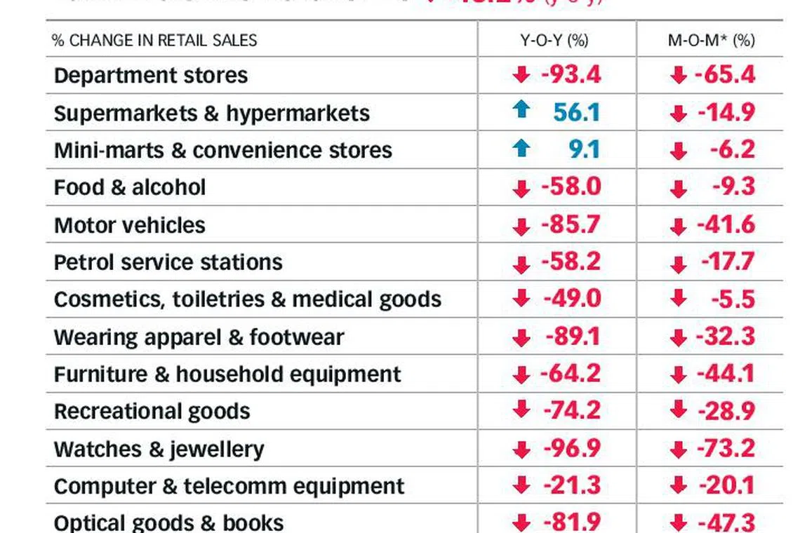 Even with big-ticket motor vehicle purchases excluded, May's fall in retail sales was 45.2 per cent. Supermarkets and hypermarkets, as well as mini-marts and convenience stores, were the only types of retailers to post revenue growth for the month.
