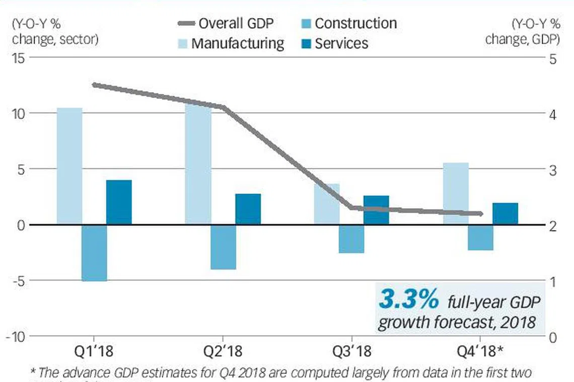 The economy chalked year-on-year growth of 2.2 per cent in the final quarter of 2018, according to flash estimates on Wednesday - easing a tad from 2.3 per cent the quarter before.