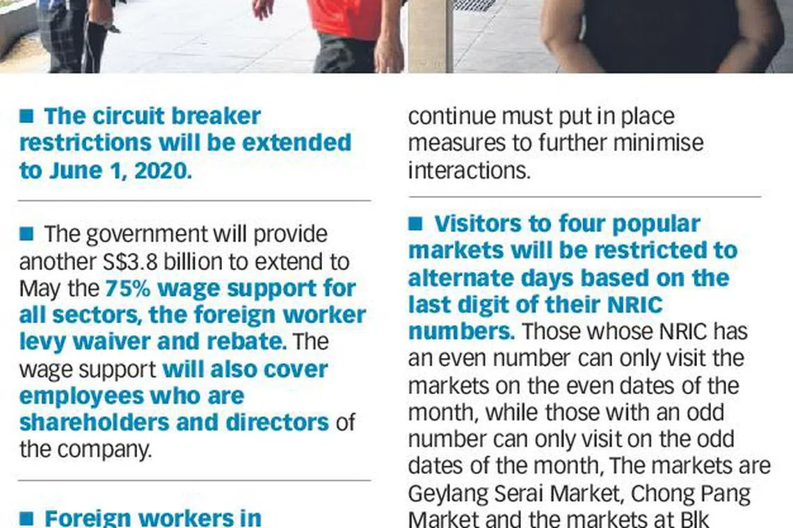 WITH the four-week extension to the circuit-breaker measures, S$3.8 billion in extended support will be given to workers and businesses, said Deputy Prime Minister and Finance Minister Heng Swee Keat on Tuesday.