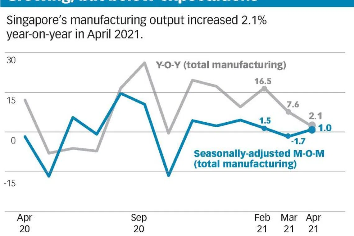 Singapore factory output posts sixth straight month of growth; up 2.1% in April: EDB