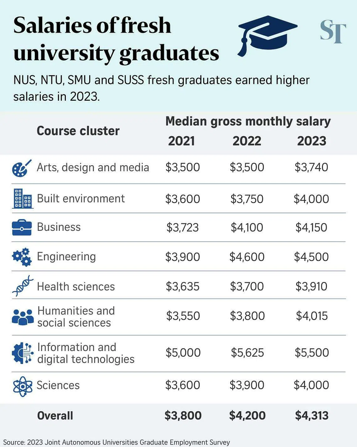 The latest graduate employment survey, released on Feb 22, showed that the median gross salaries of fresh graduates rose to S$4,313, up from S$4,200 in 2022.